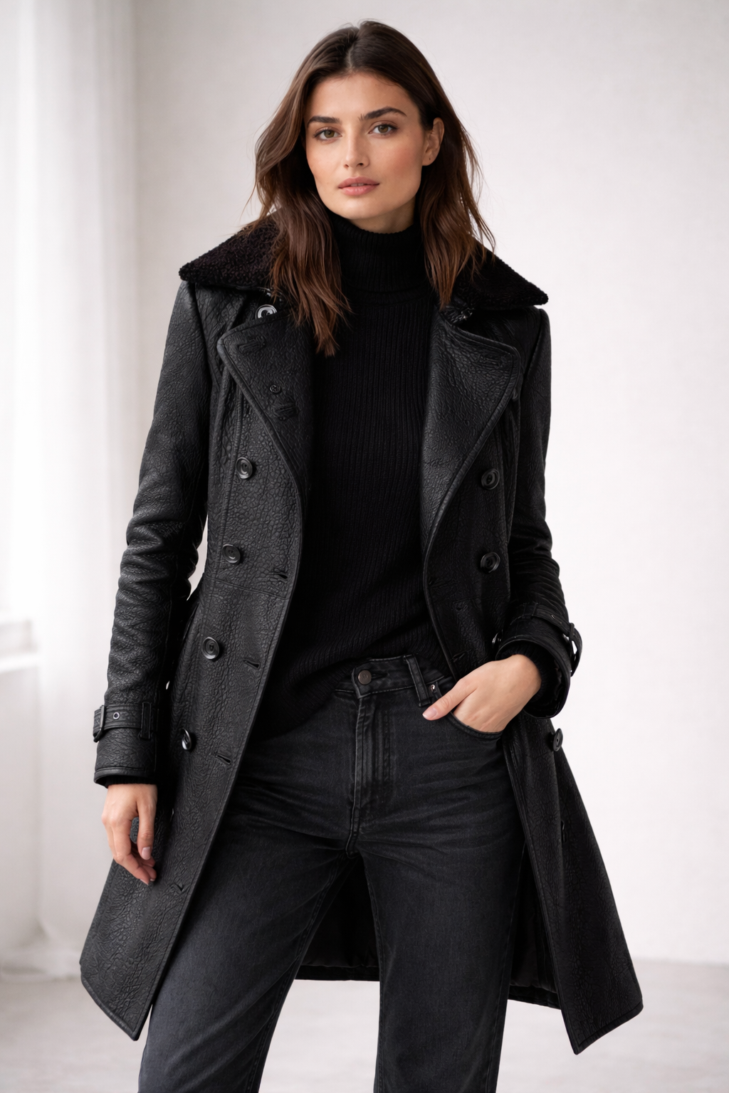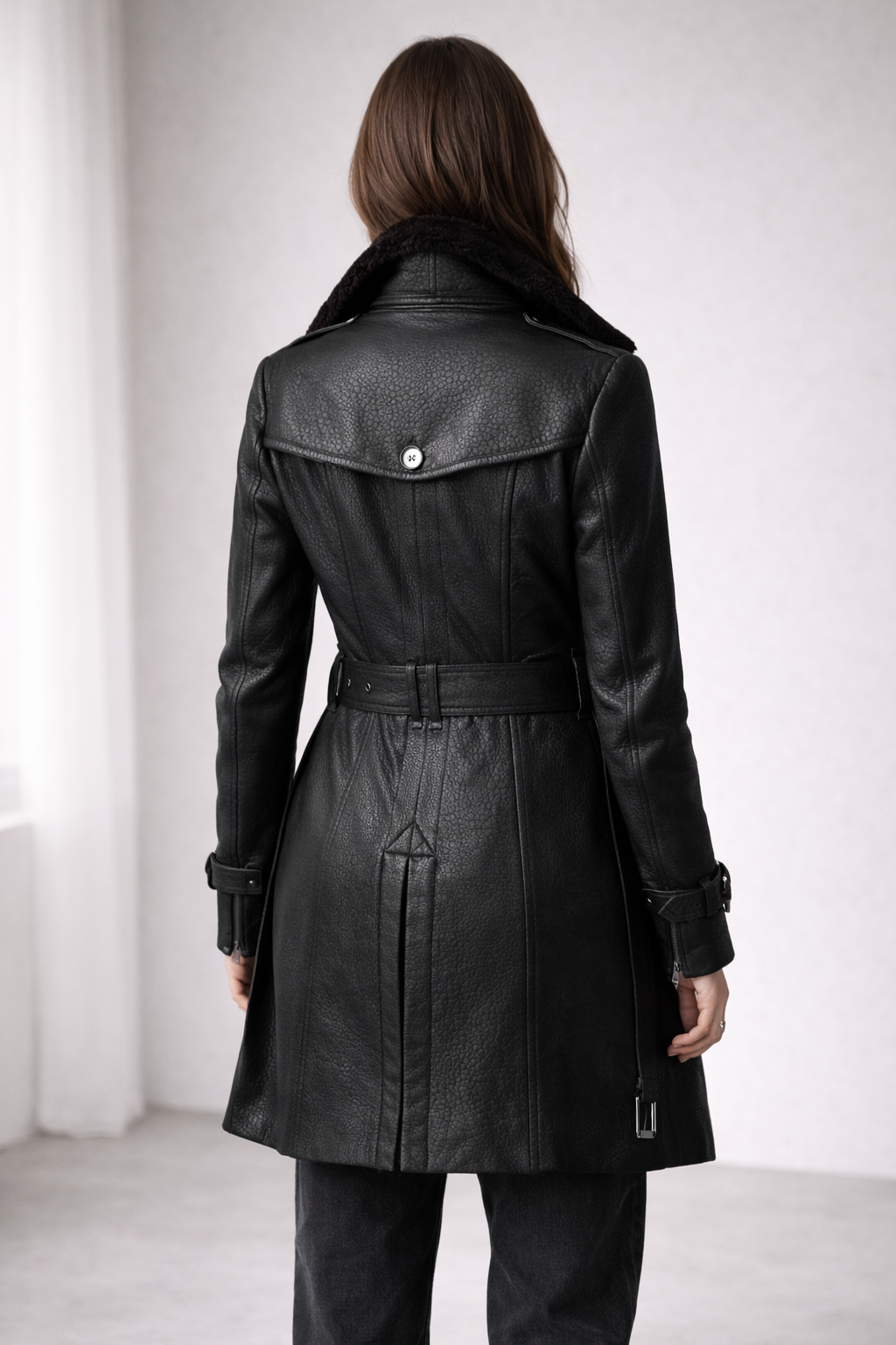 Denna eleganta kappa från Lovia Studios är designad för dig som vill kombinera stil och funktion på ett självklart sätt. Den strukturerade läderlooken ger ett sofistikerat uttryck, medan den figurnära silhuetten skapar en feminin och modern känsla. Ett tidlöst ytterplagg som lyfter varje outfit, säsong efter säsong.